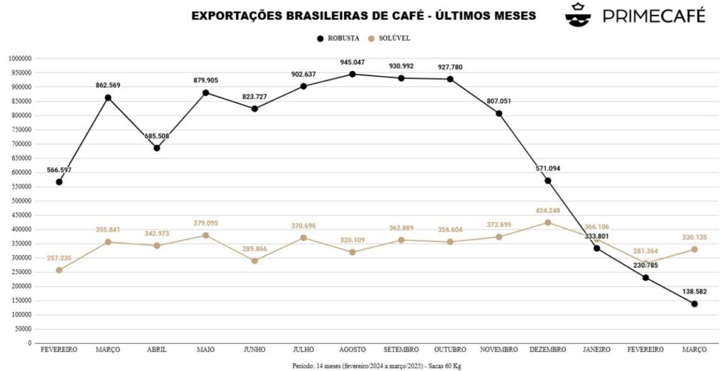 Com o desempenho no mês passado, o Brasil acumula embarques de 36,885 milhões de sacas nos nove meses da safra 2024/25, recebendo um recorde de US$ 11,095 bilhões em divisas para esse intervalo. No período de julho de 2023 a março de 2024, foi registrada evolução de 5% em volume e 58,2% em receita.