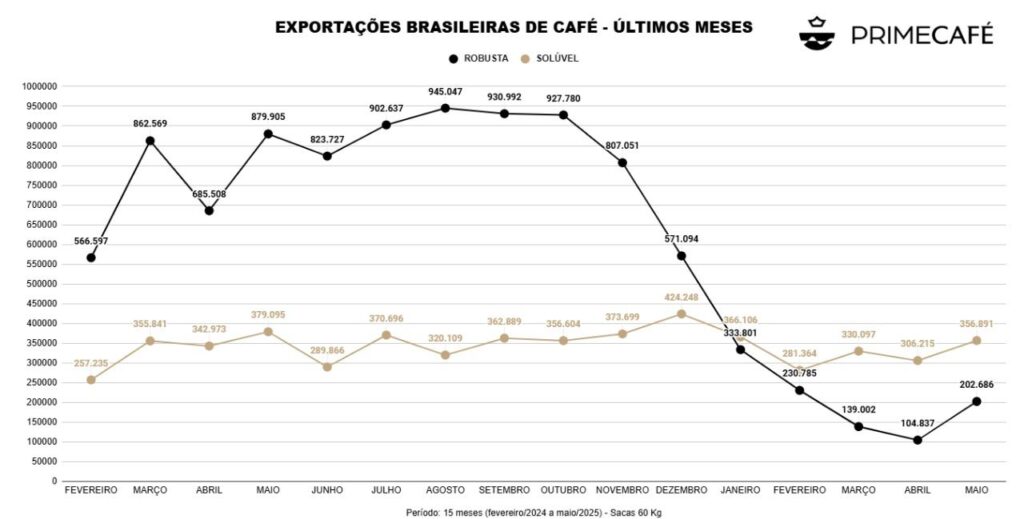 Fonte: https://globorural.globo.com/agricultura/cafe/noticia/2025/06/exportacoes-de-cafe-do-brasil-cairam-33percent-em-maio-mas-receita-cresceu.ghtml